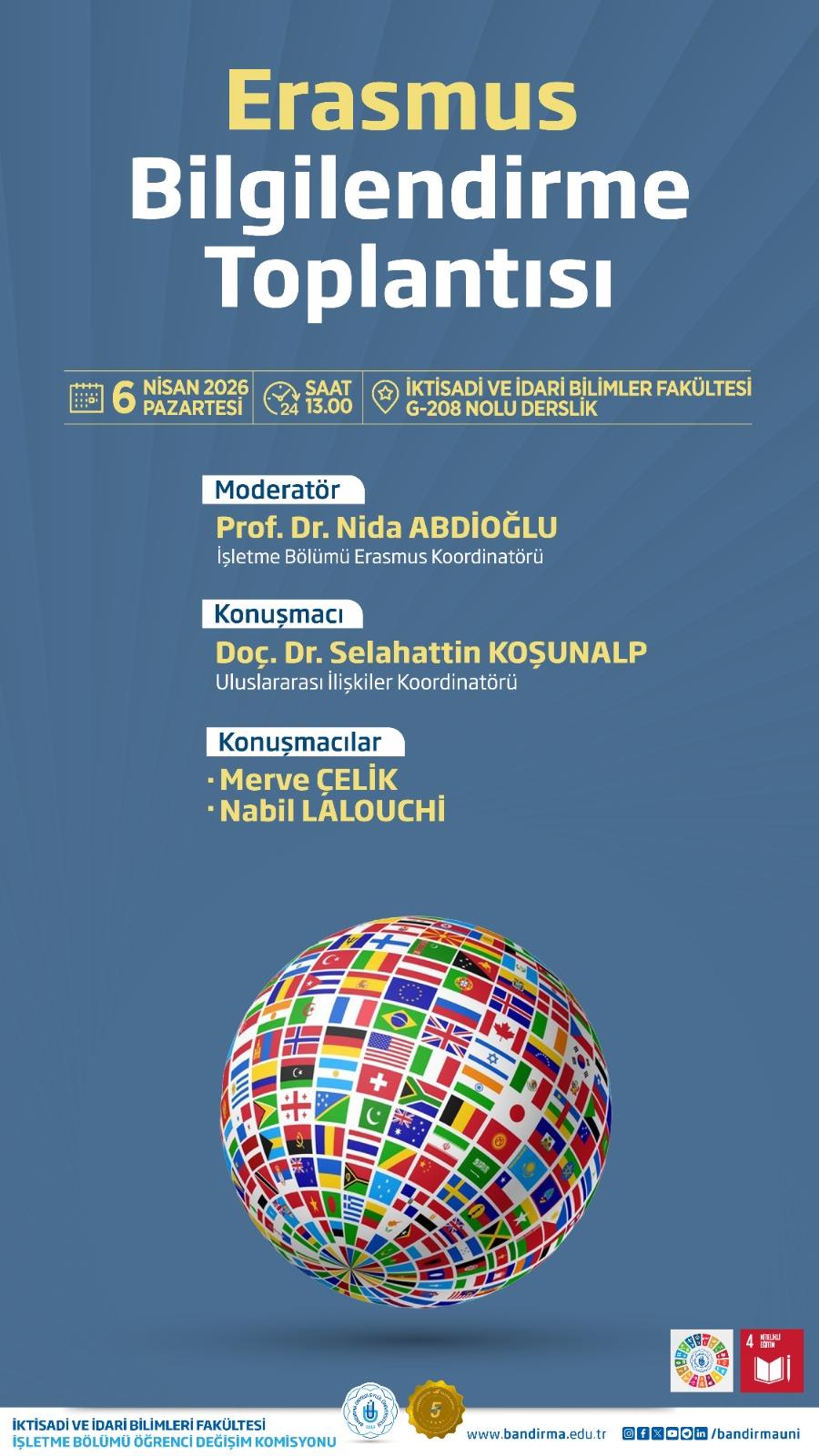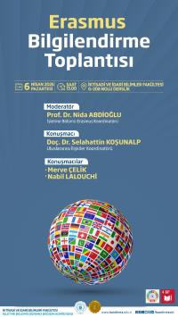 The Department of Business Administration’s Student Exchange Committee will host an Erasmus information session. Merve Çelik and Nabil Lalouchi, students who have participated in the Erasmus student mobility program in recent years, will share their experiences with our students. Additionally, Associate Professor Selahattin Koşunalp, the International Relations Coordinator, will attend the meeting. The meeting will be moderated by the Department of Business Administration’s Erasmus Coordinator, Prof. Dr. Nida Abdioğlu. The meeting will take place on Monday, April 6, at 1:00 PM in Room G-208 of the Faculty of Economics and Administrative Sciences. We look forward to seeing all interested students at our meeting.
