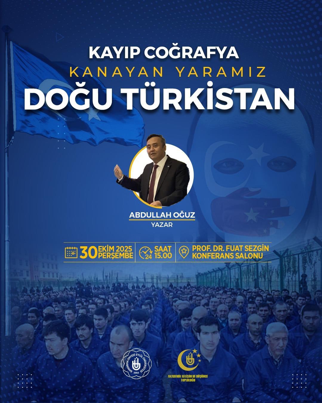 A conference titled "Lost Geography: Our Bleeding Wound: East Turkestan" will be held at the Prof. Dr. Fuat Sezgin Conference Hall on Thursday, October 30, 2025, at 3:00 PM. Author Abdullah Oğuz will be the speaker, and all students are invited to the conference.