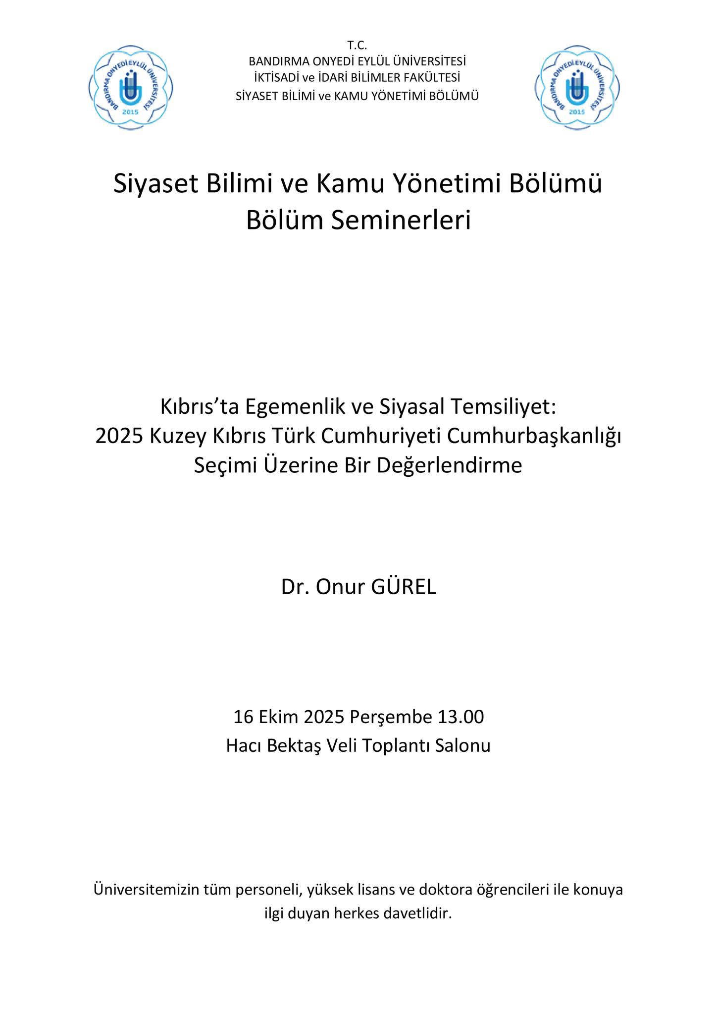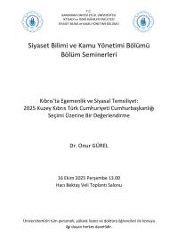 We are opening our Fall Semester Department Seminars with a seminar by Dr. Onur Gürel titled “Sovereignty and Political Representation in Cyprus: An Assessment of the 2025 Presidential Election in the Turkish Republic of Northern Cyprus.” We wish a successful seminar period and look forward to seeing all interested participants.