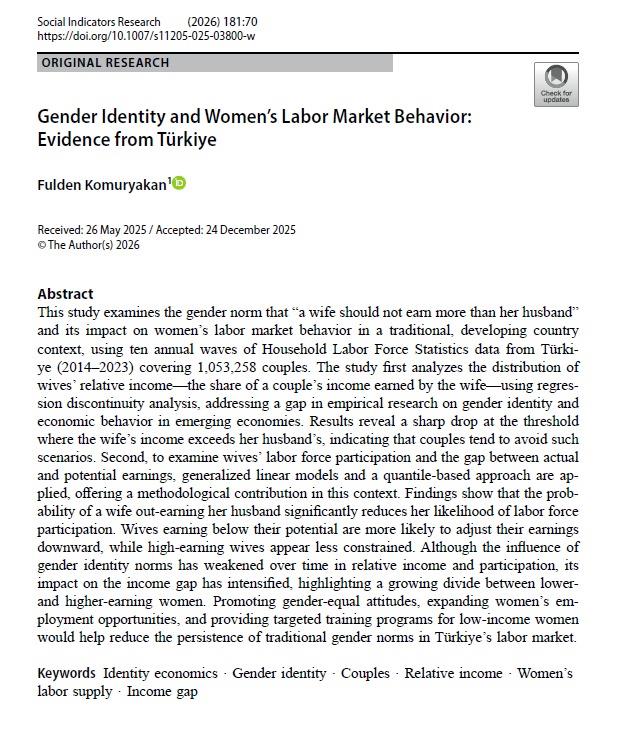 Bölümümüz öğretim üyelerinden Dr. Öğr. Üyesi Fulden Kömüryakan Kaygısız'ın "Gender Identity and Women’s Labor Market Behavior: Evidence from Türkiye" başlıklı çalışması Social Indicators Research dergisinde yayımlanmıştır. Akademik katkılarından dolayı kendisini tebrik ediyor, başarılarının devamını diliyoruz!