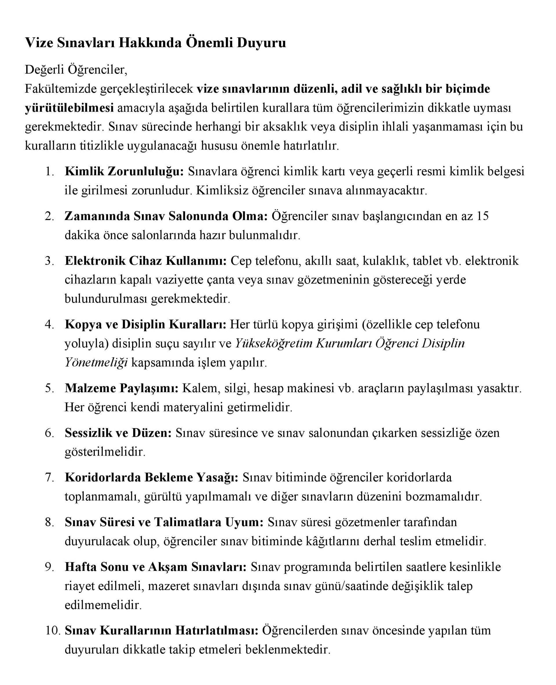 2025-2026 Eğitim-Öğretim Güz Dönemi Vize Sınavları 10 - 16 Kasım 2025 tarihleri arasında yapılacaktır.
