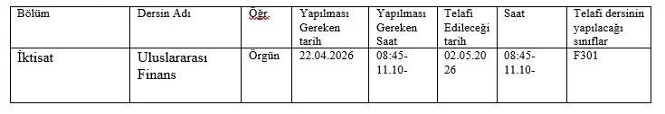 Fakültemiz öğretim üyelerinden Doç. Dr. Musa BAYIR, 21.04.2026 - 25.04.2026 tarihleri arasında üniversite dışındaki resmi görevli olması nedeniyle belirtilen tarihteki dersini gerçekleştiremeyecektir. İlgili dersin telafi programı aşağıda belirtilmiştir: