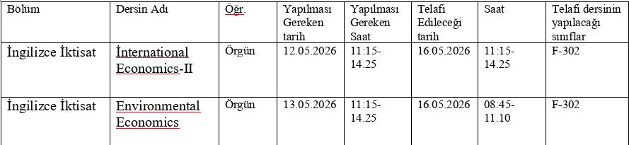 İngilizce İktisat bölümü bünyesinde verilen International Economics-II (Örgün) dersinin, normal şartlarda 12.05.2026 tarihinde 11:15-14:25 saatleri arasında yapılması gereken oturumu; 16.05.2026 tarihinde saat 11:15-14:25 arasında F-302 numaralı derslikte telafi edilecektir
