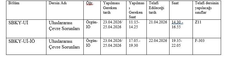 • SBKY-Uİ (Gündüz Grubu) İçin: Normalde 23-25 Nisan tarihlerinde yapılması gereken dersin telafisi 21 Nisan 2026 Salı günü saat 14.30 - 16.55 arasında Z11 nolu sınıfta yapılacaktır.
