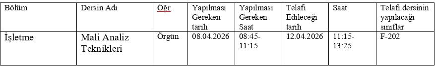 Prof. Dr. Hasan Aydın OKUYAN ’ın 12.04.2026 tarihli Mali Analiz Teknikleri dersinin telafisi 12.04.2026 tarihinde 11.15-13:25 saatleri arasında F-202 no'lu sınıfta yapılacaktır.