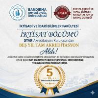 Bandırma Onyedi Eylül Üniversitesi İktisadi ve İdari Bilimler Fakültesi İktisat Bölümü, uluslararası saygınlığıyla bilinen STAR Akreditasyon Kuruluşu tarafından gerçekleştirilen değerlendirme süreci sonucunda beş yıllık tam akreditasyon almaya hak kazanmıştır. Bu önemli başarı, bölümümüzün eğitim kalitesi, akademik program standartları, öğretim kadrosu nitelikleri ve sürekli iyileştirme anlayışının bir göstergesidir. STAR akreditasyonu, bölümümüzün uluslararası standartlarda eğitim verdiğinin ve mezunlarımızın rekabet gücünü artıracak donanıma sahip olduğunun tescilidir. Dekanlığımız tarafından fakültemizde ilk ve tam akredite olan İktisat bölümünün göstermiş olduğu gayret, özveri ve değerli çalışmalarından dolayı emeği geçen tüm akademik ve idari personelimize ve öğrencilerimize teşekkür ediyoruz. Bandırma Onyedi Eylül Üniversitesi İktisadi ve İdari Bilimler Fakültesi olarak, akademik kaliteyi sürekli geliştirme hedefimiz doğrultusunda, ulusal ve uluslararası akreditasyon süreçlerinde başarılar elde etmeye devam edeceğiz.