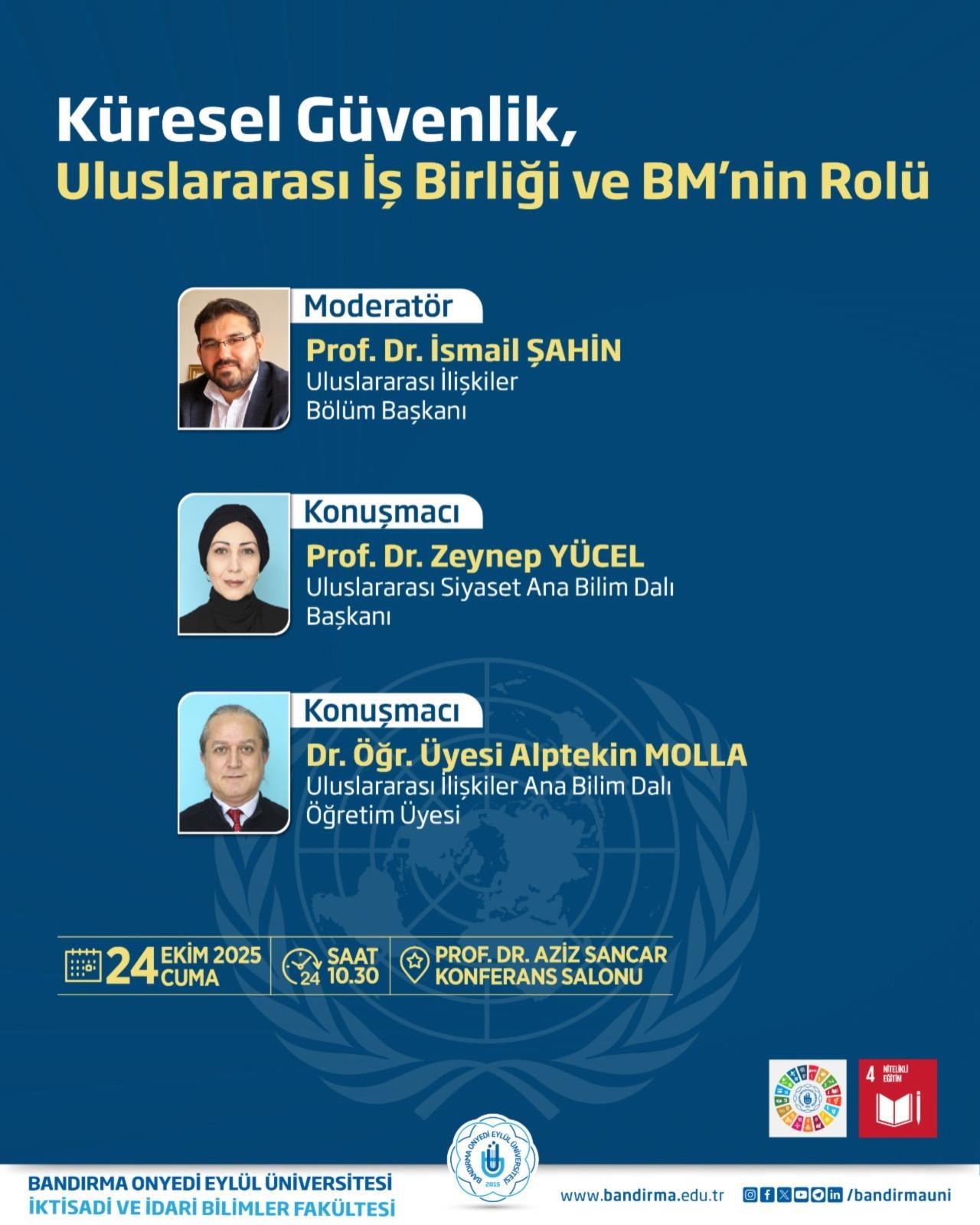 İktisadi ve İdari Bilimler Fakültemiz tarafından, uluslararası güvenlik perspektifinden iş birliği mekanizmalarını ve Birleşmiş Milletler’in rolünü ele almak amacıyla “Küresel Güvenlik, Uluslararası İş Birliği ve BM’nin Rolü” başlıklı bir panel düzenlenecektir.