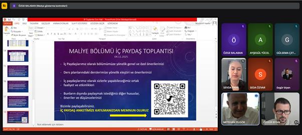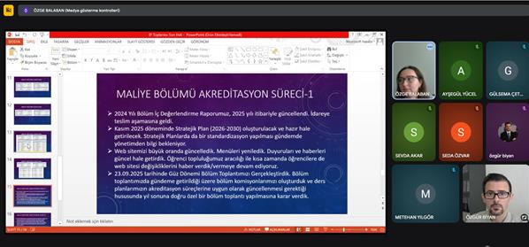 Bölüm Başkanımız Prof. Dr. Özgür BİYAN ve Bölüm Başkan Yardımcısı Dr. Öğr. Üyesi Özge BALABAN tarafından modere edilen ve sunum yapılan toplantıya bölümün akademik personeli ve Üniversitemiz kurum içi paydaşlarımız katılım gösterdi.
