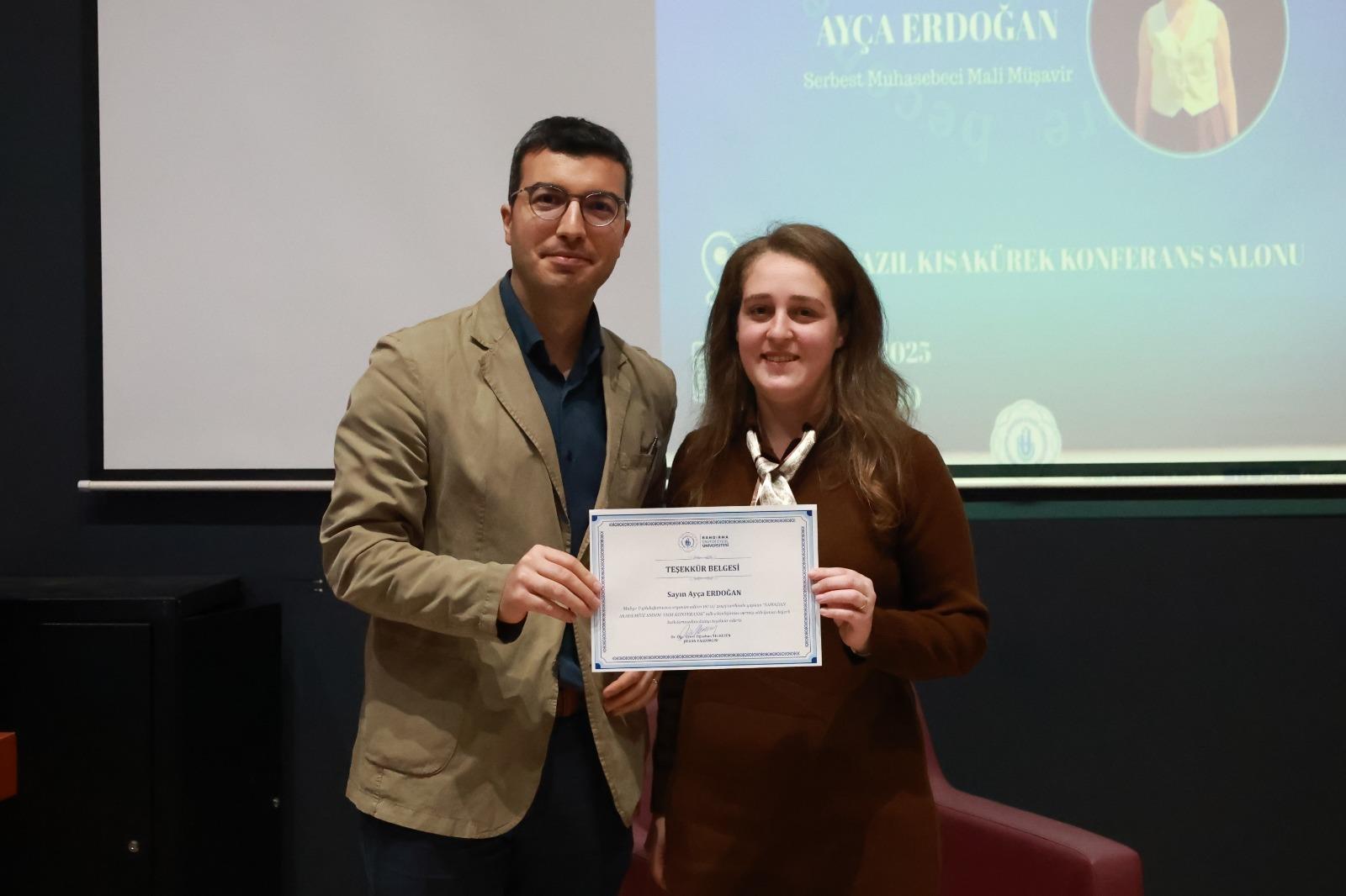 Konferansa panelist olarak YMM Ömer Saraç ve SMMM Ayça Erdoğan katılarak, Yeminli Mali Müşavirlik (YMM) ve Serbest Muhasebeci Mali Müşavirlik (SMMM) mesleklerine ilişkin bilgi ve deneyimlerini öğrencilerle paylaştı. Etkinlikte ayrıca Maliye Bölüm Başkanımız Prof. Dr. Özgür Biyan ile Maliye Topluluğu danışmanı ve aynı zamanda İİBF Dekan Yardımcısı Dr. Öğr. Üyesi Oğuzhan Yelkesen de yer alarak etkinliğe destek verdi.