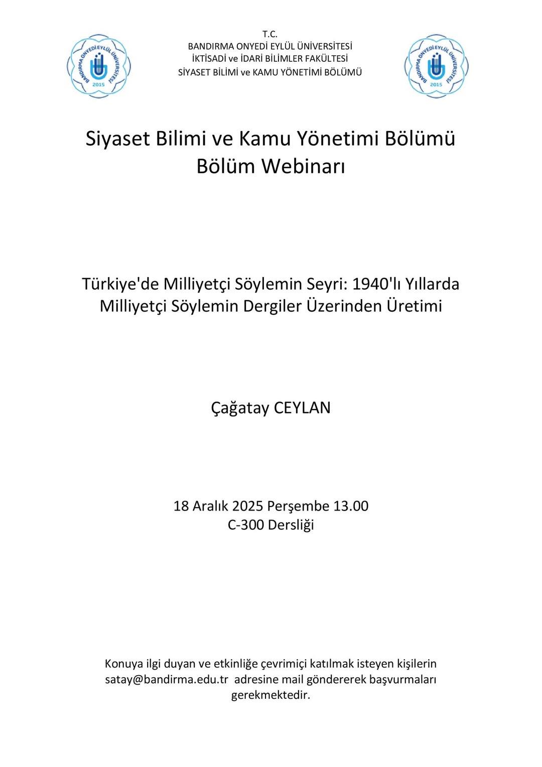 Bu dönem düzenleyeceğimiz dördüncü bölüm seminerimizi webinar formatında düzenleyeceğiz. Çağatay Ceylan'ın "Türkiye'de Milliyetçi Söylemin Seyri: 1940'lı Yıllarda Milliyetçi Söylemin Dergiler Üzerinden Yeniden Üretimi" başlıklı sunumuna sizleri de bekleriz. Konuya ilgi duyan ve etkinliğe çevrimiçi katılmak isteyenler satay@bandirma.edu.tr adresine mail atarak başvuru yapmalıdır.