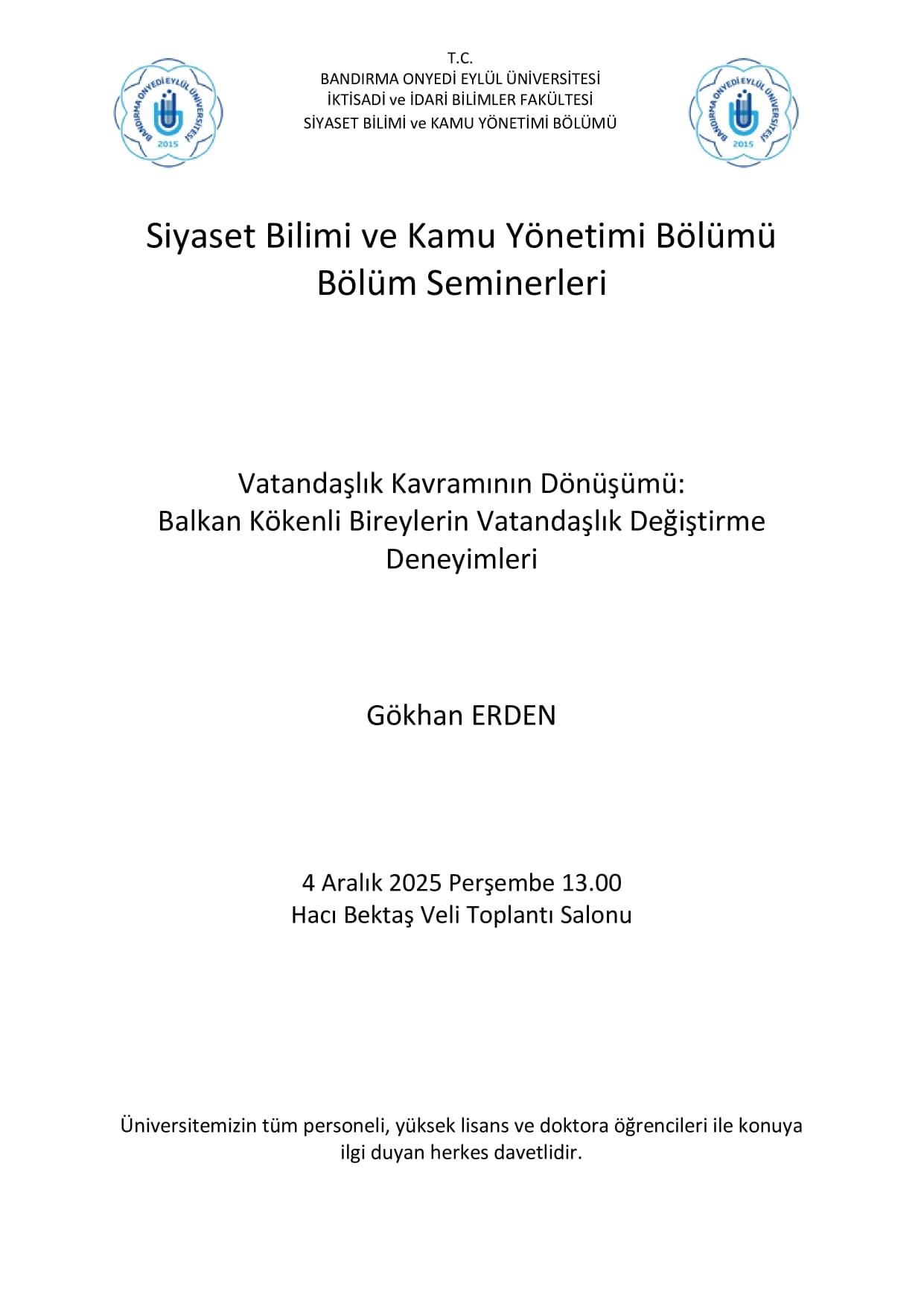 Bölüm seminer serimiz 4 Aralık Perşembe günü saat 13:00'da, doktora öğrencimiz Gökhan ERDEN'in " Vatandaşlık Kavramının Dönüşümü:Balkan Kökenli Bireylerin Vatandaşlık Değiştirme Deneyimleri" başlıklı sunuşuyla devam edecektir. Üniversitemiz tüm personeli, yüksek lisans ve doktora öğrencileri ile konuya ilgi duyan herkes davetlidir.