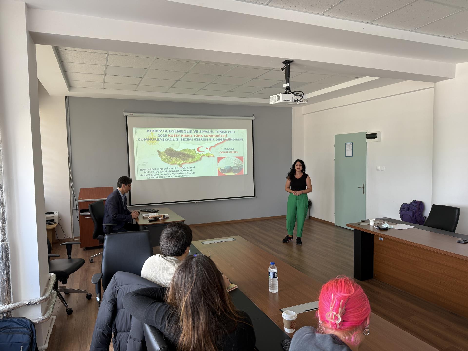 Bölüm seminerlerimiz 2025-2026 Eğitim Öğretim yılında da davem ediyor. Dr. Onur Gürel'in "Kuzey Kıbrıs Türk Cumhuriyeti Cumhurbaşkanlığı Seçimleri Üzerine Bir Değerlendirme" başlıklı semineriyle başladık. Dr. Onur Gürel'in sunumumun ardından soru-cevap ve tartışma ile devam eden seminerimize öğretim üyelerimiz, yüksek lisans ve doktora öğrencilerimiz katılım göstermişleridir. Dr. Onur Gürel'e sunumu için teşekkür eder, akademik yaşamında başarılar dileriz.
