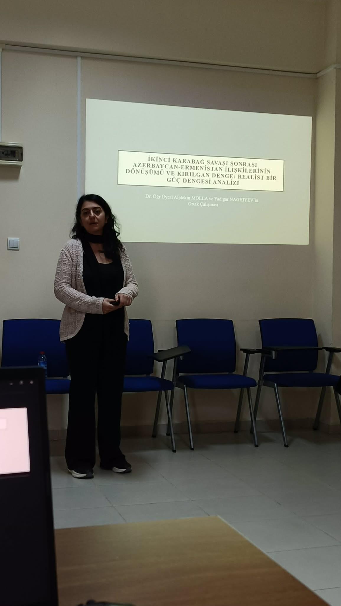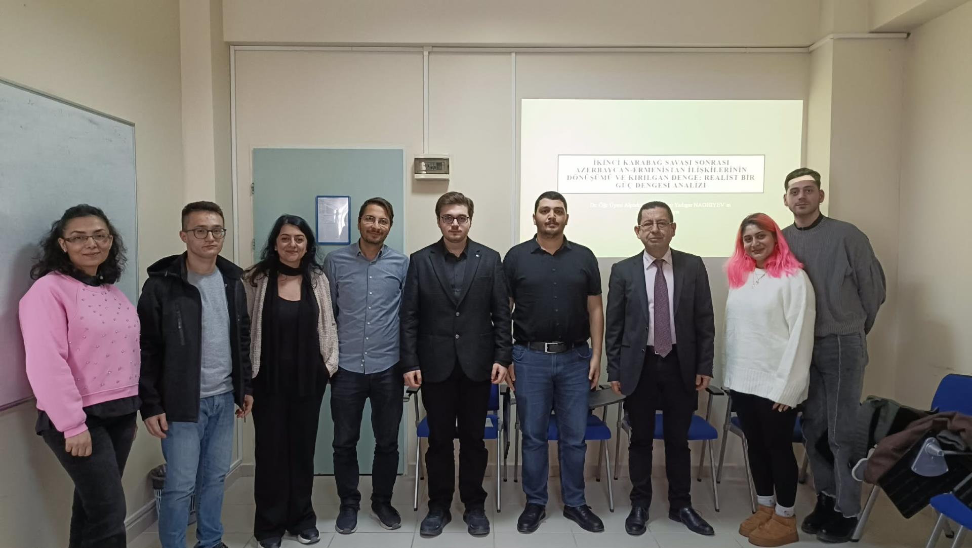 12 Mart 2026 tarihinde düzenlediğimiz bölüm seminerimizde doktora öğrencimiz Yadigar Nagiyev bize "İkinci Karabağ Savaşi Sonrası Azerbeycan Ermenistan İlişkilerinin Dönüşümü ve Kırılgan Denge: Realist Bir Güç Dengesi Analizi" başlıklı çalışmasını sundu. Kendisine bu değerli katkısı için, katılımcılara da sorularıyla canlı bir tartışma ortamı yarattıkları için SBKY Bölümü olarak teşekkürlerimizi sunarız.
