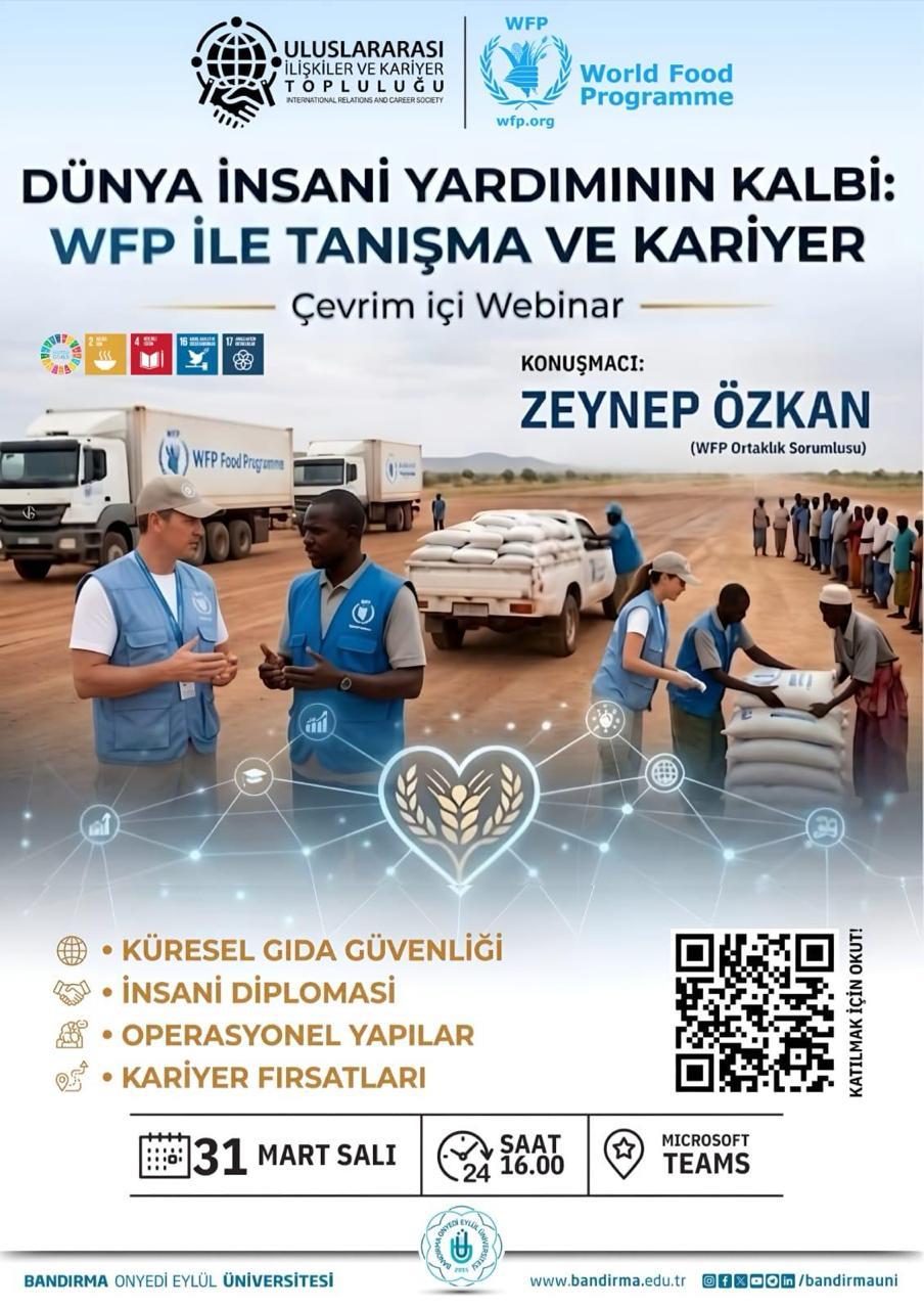 Bandırma Onyedi Eylül Üniversitesi Uluslararası İlişkiler ve Kariyer Topluluğu olarak, WFP Ortaklık Sorumlusu Zeynep Özkan’ın katılımıyla gerçekleştireceğimiz özel webinara davetlisiniz!